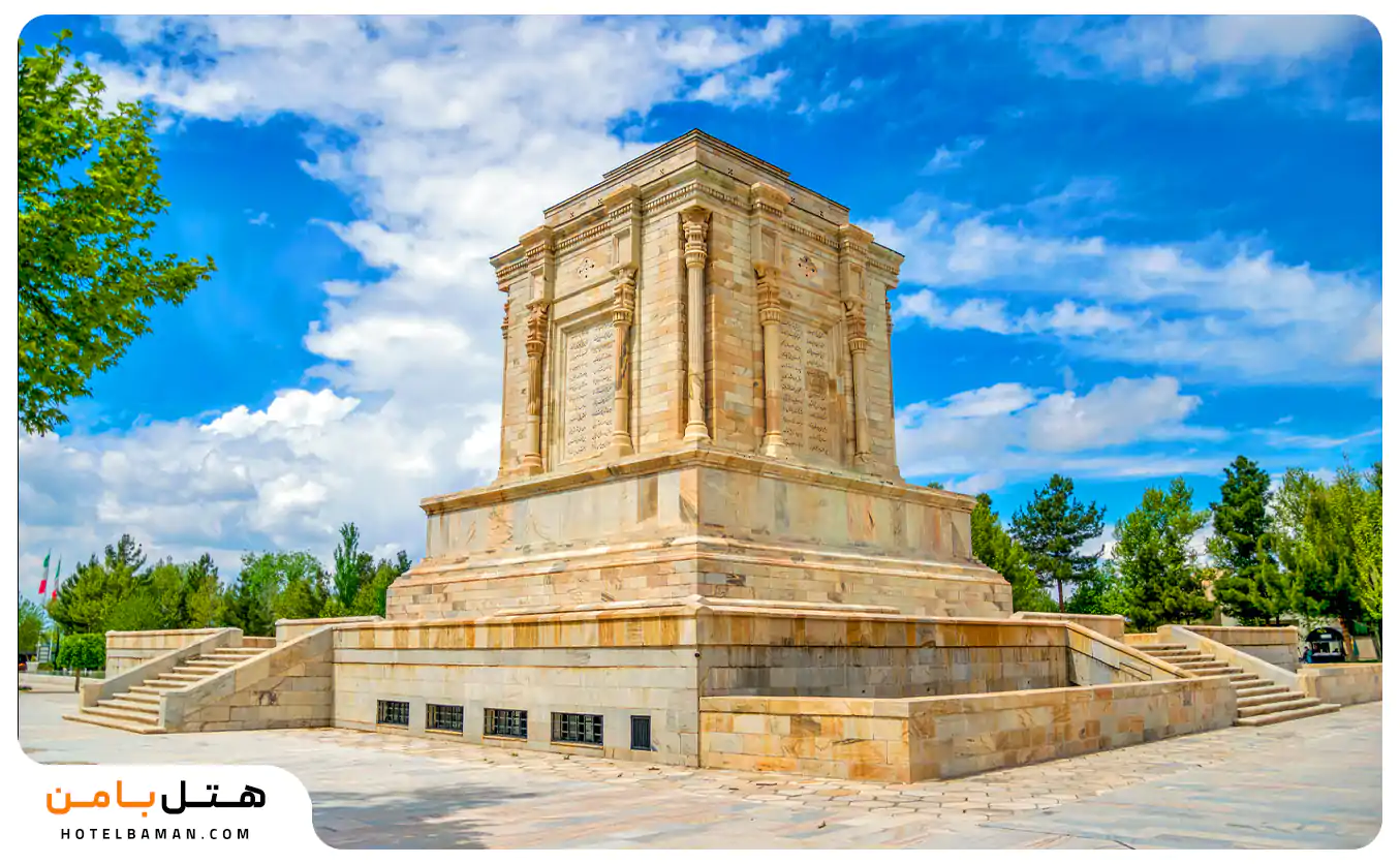است. ستون ها، حجاری ها و کتیبه های سنگی آن یادآور شکوه دوران باستان ایران هستند. آرامگاه بر روی سکویی بلند ساخته شده و از سنگ مرمر سفید و تراورتن
