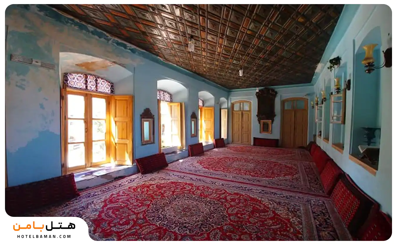 بزرگ با سقف چوبی منبت کاری شده است. حمام آن با مساحت ۱۲۷ متر و طراحی ویژه، شامل بخش هایی