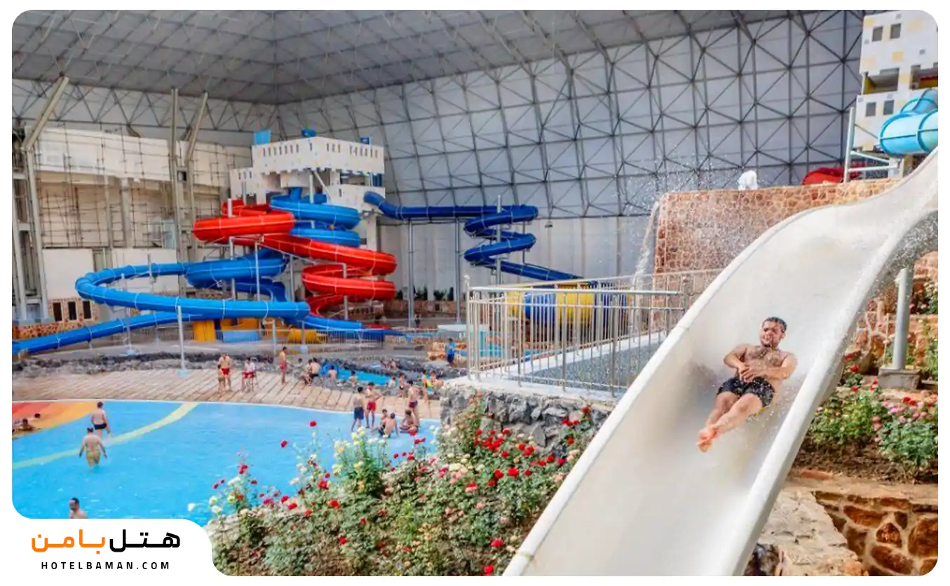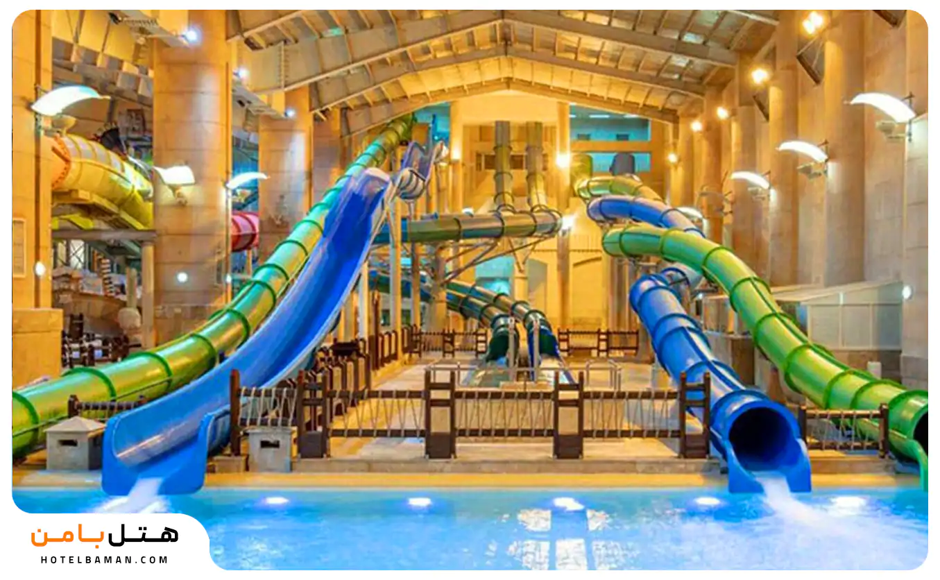 در ادامه معرفی پارک های آبی به سرزمین موج های خروشان مشهد می پردازیم. این مجموعه طبق بیان سایت رسمی اش بزرگ ترین مجموعه آبی سرپوشیده در جهان با مساحتی بالغ بر 60,000 متر مربع است. از امکانات این مجموعه به وجود بیش از 65 سرسره مدرن و مهیج با استاندارد های جهانی و نقشه های متفاوت برای مهمانان عزیز اشاره کرد. لیست برخی امکانات این پارک آّبی سرپوشیده برای شما آورده شده است: